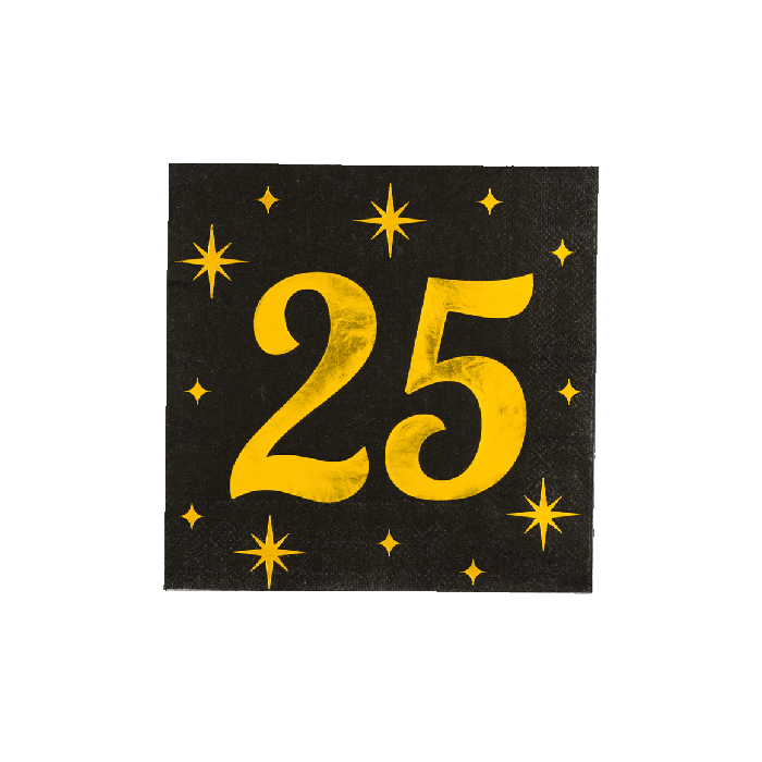 Maak jouw 25e verjaardag of jubileum compleet met deze stijlvolle servetten in zwart en goud. De set bevat 16 servetten van 19 cm, bedrukt met het cijfer 25 in een luxe feestelijk design. Perfect om de feesttafel aan te kleden en handig bij taart, hapjes en drankjes. Combineer de servetten met bijpassende borden, bekers en andere 25 jaar versiering in zwart en goud voor een chique en onvergetelijk feest.