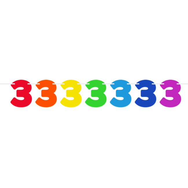 Een slinger met grote cijfers 3. De cijfers ontvangt u in verschillende vrolijke kleuren. Leuk en opvallend voor een kinderverjaardag. Lengte: 6 meter. De hoogte van de cijfers is 25cm.