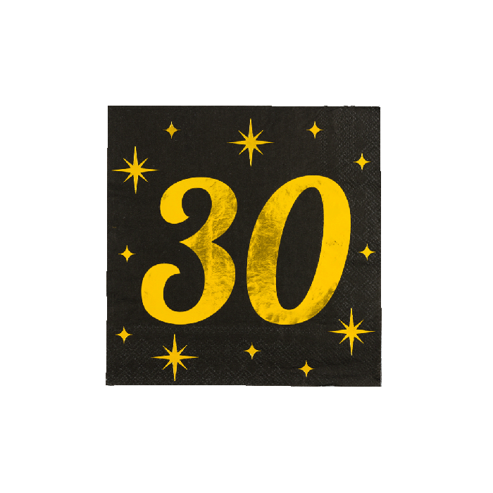 Maak jouw 30e verjaardag of jubileum compleet met deze stijlvolle servetten in zwart en goud. De set bevat 16 servetten van 19 cm, bedrukt met het cijfer 30 in een luxe feestelijk design. Perfect om de feesttafel aan te kleden en handig bij taart, hapjes en drankjes. Combineer de servetten met bijpassende borden, bekers en andere 30 jaar versiering in zwart en goud voor een chique en onvergetelijk feest.