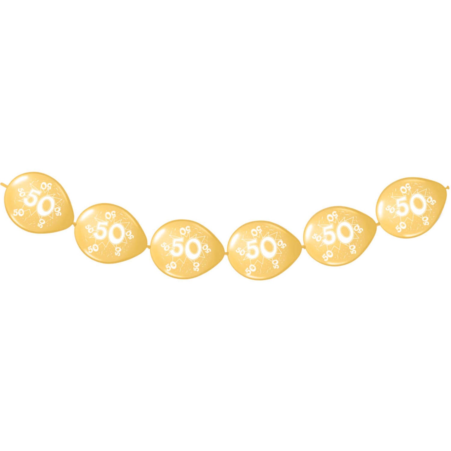 Gouden knoopballonnen met het cijfer 50. Deze goudkleurige ballonnenslinger is perfect voor een 50 jarig gouden jubileum of gouden huwelijk. Met deze knoopballonnen maak je eenvoudig een prachtige ballonnenslinger van ongeveer 3 meter.
