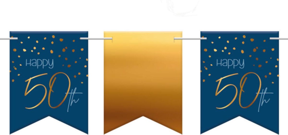 Vlaggenlijn Elegant True Blue 50 Jaar - 6 meter. Inhoud: 1 vlaggenlijn van 6 meter. Kleur: Blauw. Bijvoorbeeld te gebruiken tijdens de volgende feestgelegenheid/feestgelegenheden: Verjaardag, Jubileum. De vlaggenlijn is 6 meter lang met 10 vlaggetjes van 23 cm hoog. Het artikel is gemaakt van papier.