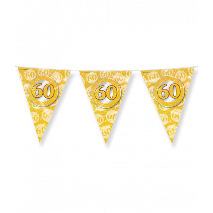 De vlaggenlijn 60 jaar getrouwd is de ideale versiering op het jubileumfeest van een 60 jarig huwelijk. Door de gebruikte kleuren en het vrolijke design vallen deze party vlaggen dan ook extra goed op! De vlaggetjes zijn gemaakt van folie en zijn aan beide zijden bedrukt. Ze hebben een lengte van 10 meter.