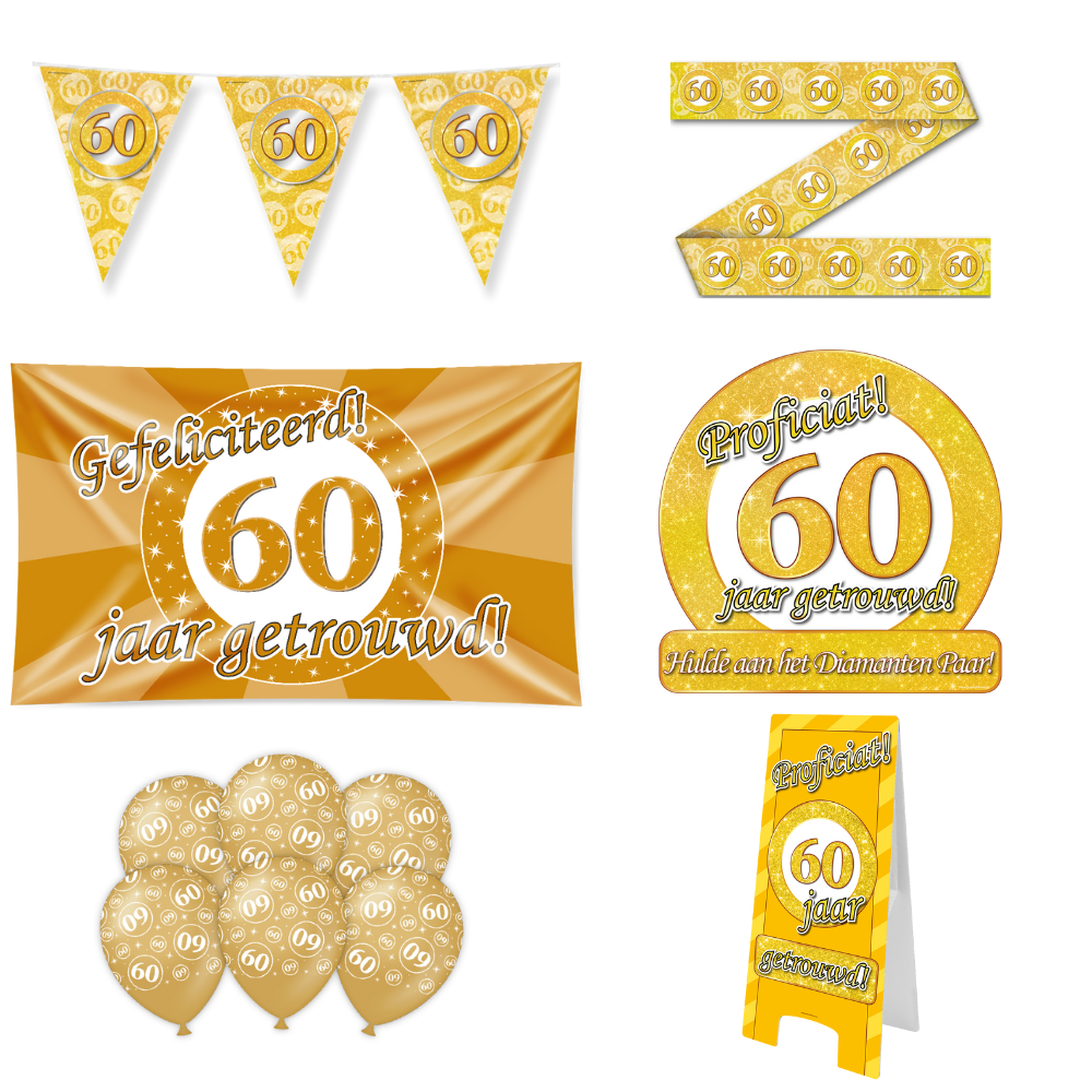 Bestel vandaag nog het 60 Jaar Getrouwd Versiering Pakket Luxe en maak van dit onvergetelijke jubileum een prachtig feest!