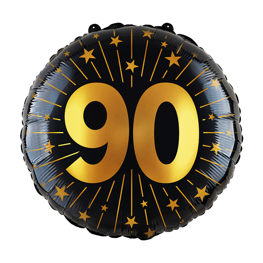 De folieballon is bedrukt met het cijfer 90 in een zwart-goud ontwerp en kan eenvoudig worden gevuld met helium of lucht. Hang hem los in de ruimte, gebruik hem als tafeldecoratie of combineer meerdere ballonnen voor een feestelijk geheel.