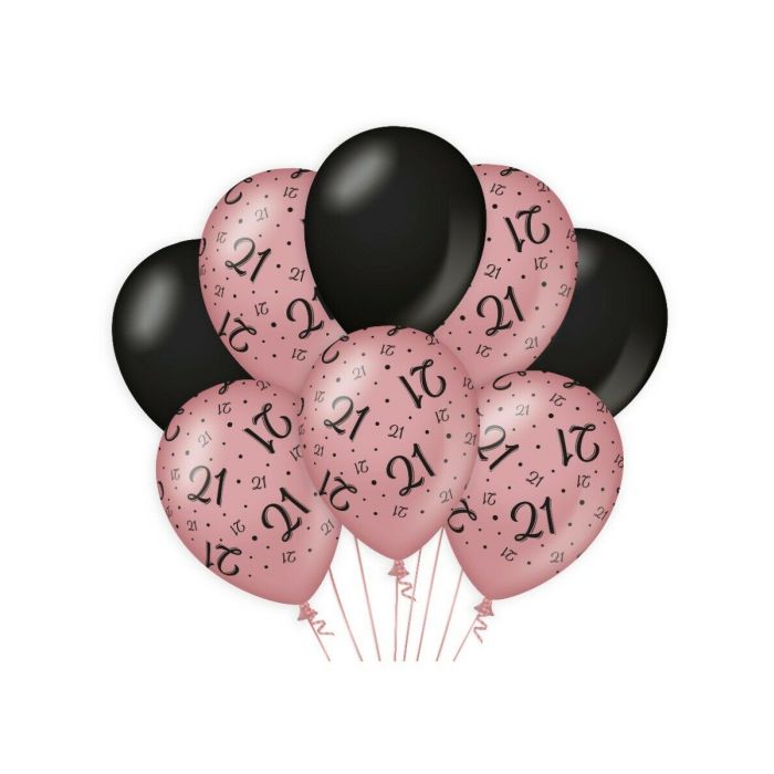 Vier jouw 21e verjaardag in stijl met deze elegante ballonnen 21 jaar in rose en zwart. De set bestaat uit 8 latex ballonnen met een formaat van 30 cm, ideaal om direct een chique en feestelijke sfeer te creëren. De ballonnen zijn bedrukt met het cijfer 21 en passen perfect bij een modern en stijlvol verjaardagsfeest. Gebruik ze als losse decoratie, in een ballonboeket of combineer ze met andere 21 jaar versiering voor een compleet geheel.