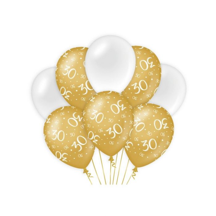 Vier jouw 30e verjaardag in stijl met deze elegante ballonnen 30 jaar in goud en wit. De set bestaat uit 8 latex ballonnen met een formaat van 30 cm en geeft jouw feestlocatie direct een luxe en feestelijke uitstraling. De ballonnen zijn bedrukt met het cijfer 30 en zijn perfect te gebruiken als losse decoratie, in een ballonboeket of gecombineerd met andere 30 jaar versiering. Ideaal voor een chique verjaardag of jubileum.