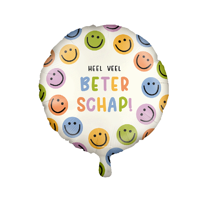 Breng een glimlach bij iemand die ziek is of zich niet zo lekker voelt met deze ronde folieballon met de tekst Heel veel beterschap. Het vrolijke ontwerp met gekleurde smileys straalt positiviteit uit en zorgt voor een opbeurend gebaar in moeilijke tijden.