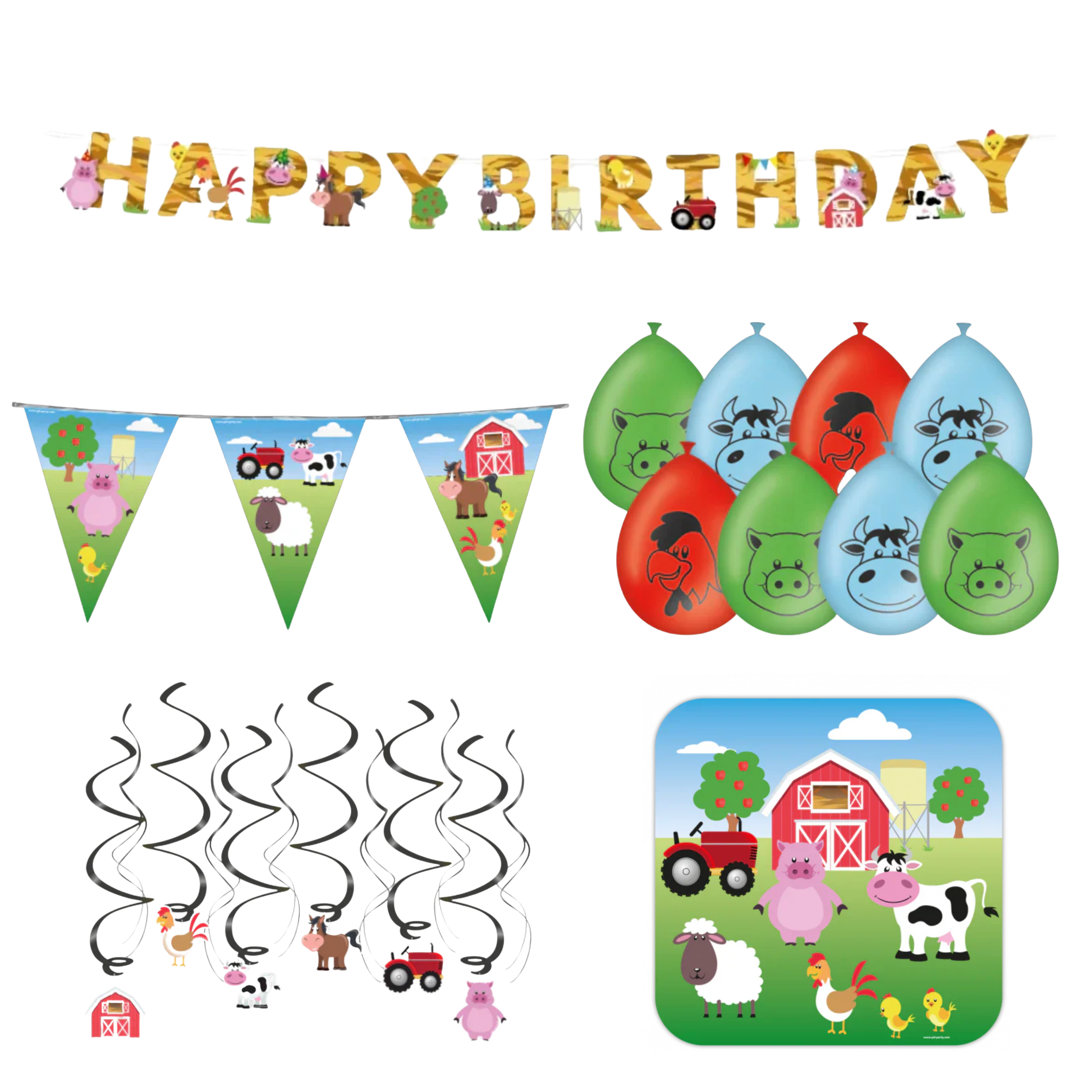 Het pakket bevat een extra lange boerderij vlaggenlijn van 10 meter waarmee je eenvoudig de woonkamer of tuin feestelijk kunt versieren. De set bevat daarnaast acht ballonnen met boerderijdieren in verschillende kleuren, die meteen voor vrolijkheid en kleur zorgen. Het stevige deurbord van 50 cm in boerderijthema is perfect om bij de ingang op te hangen, zodat iedereen meteen ziet waar het feest is. De “Happy Birthday” letterslinger in vrolijk boerderijdesign zet de jarige prachtig in het middelpunt.