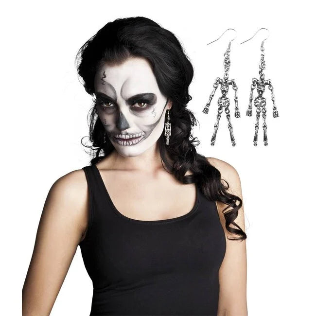 "Metalen skelet oorbellen voor vrouwen - Deze oorbellen zijn gemaakt van metaal. Ze stellen skeletten voor. Iedere oorbel is ongeveer 7 cm lang. De oorbellen zijn niet te dragen zonder gepiercte oren. Word een skelet tot in de kleinste details met deze oorbellen voor Halloween."