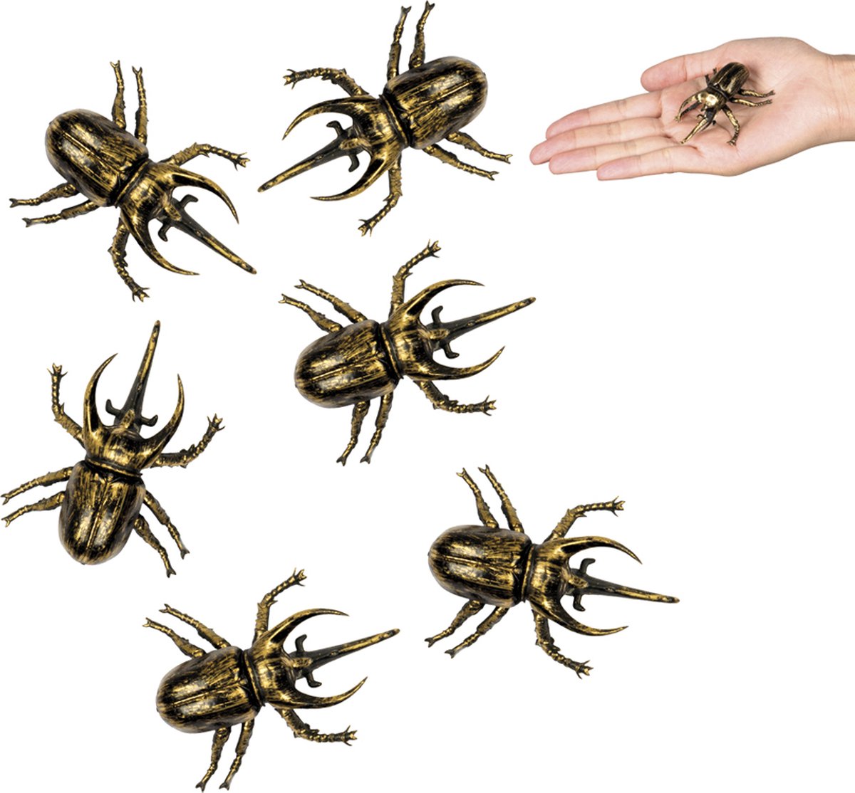 Deze set bestaat uit 6 plastic scarabees. Ze zijn zwart met een goudkleurig effect en zijn ongeveer 6 cm lang. Deze kleine insecten zullen perfect zijn om een horror tafeldecoratie te creëren op een Halloweenfeest.