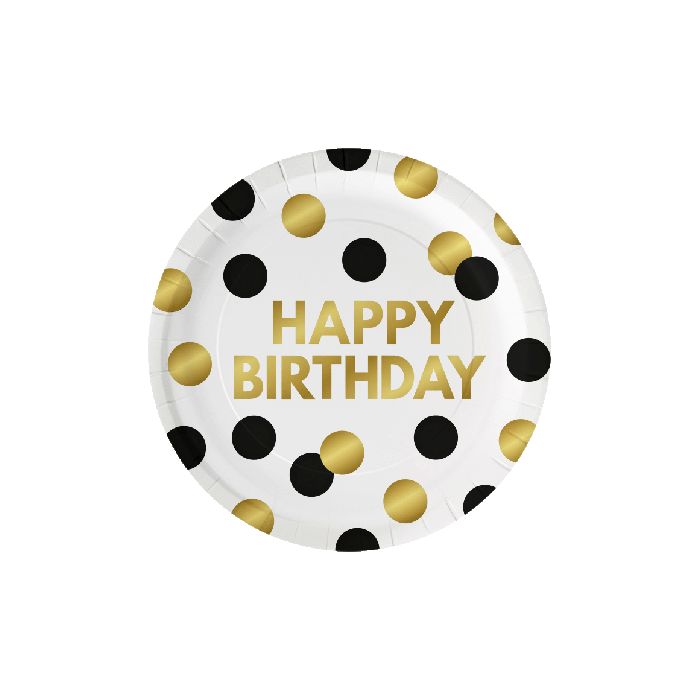 Vier jouw verjaardag in stijl met deze chique “Happy Birthday” bordjes! De witte bordjes zijn versierd met zwarte en gouden stippen en hebben een elegante uitstraling — perfect voor elke verjaardagsviering, jong of oud. Combineer met bijpassende bekers en servetten voor een feestelijk geheel.
