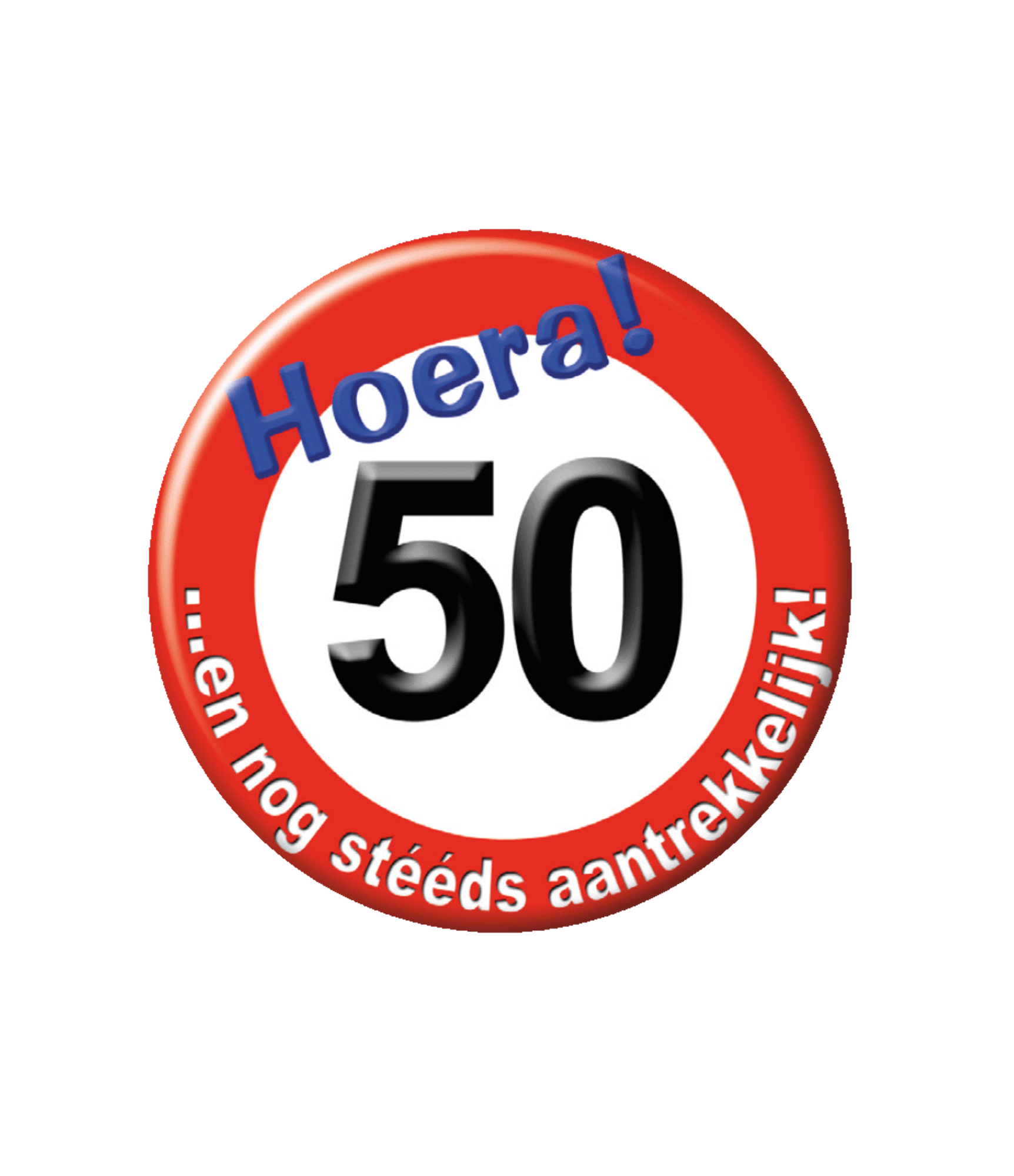 De Button 50 jaar Verkeersbord is gemaakt van metaal en heeft een diameter van ca. 5,5 cm. De Button 50 jaar Verkeersbord wordt per stuk geleverd.