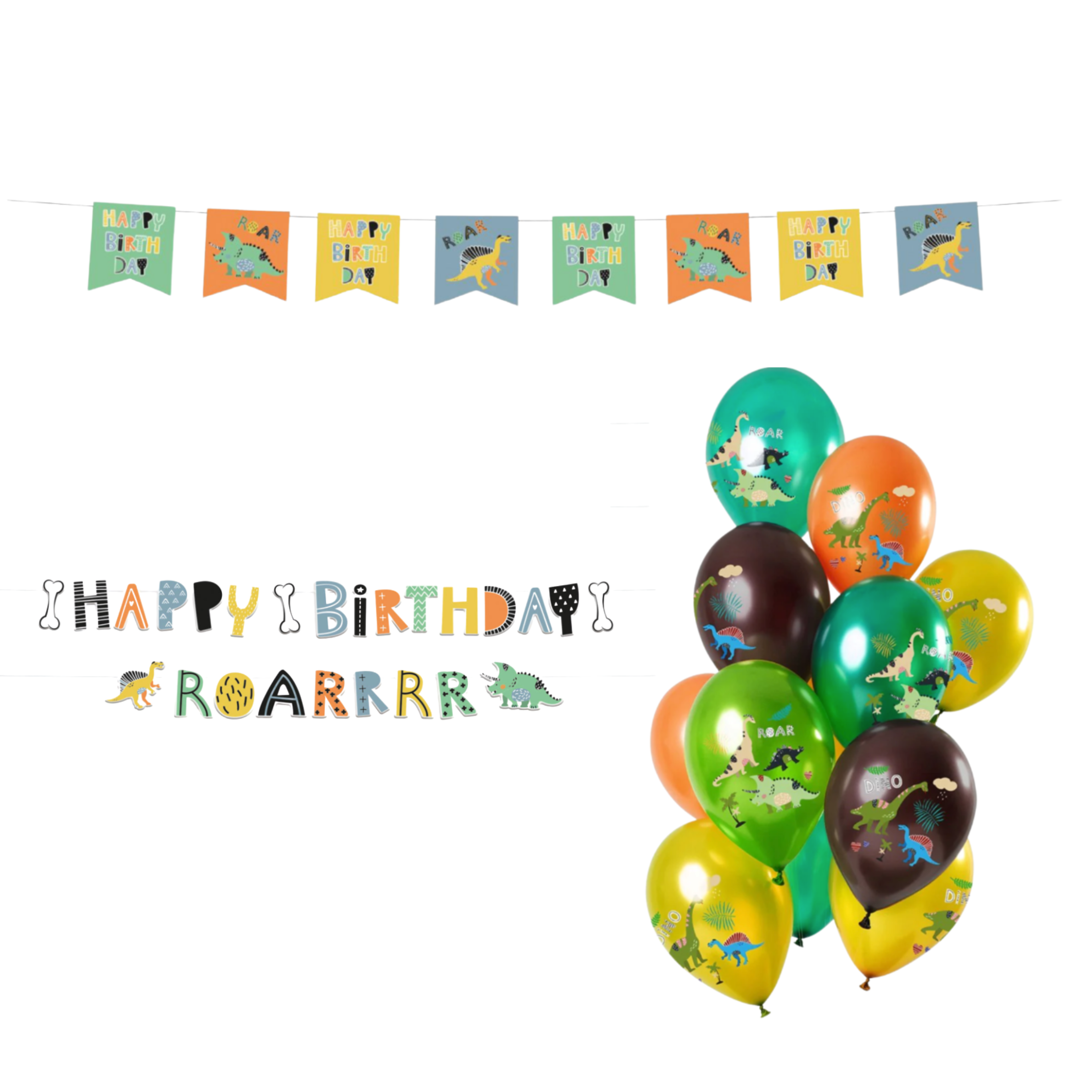 Het pakket bevat een kleurrijke vlaggenlijn in dino thema die perfect is om de feestruimte aan te kleden. Daarnaast zijn er twee letterslingers waarmee je “Happy Birthday” en “Roarrr” kunt ophangen; ideaal voor aan de muur, boven de eettafel of bij de cadeautafel. De set wordt compleet gemaakt met een ballonnenset met dino-opdruk in verschillende kleuren zoals groen, oranje, geel en bruin. Deze ballonnen geven meteen sfeer en vormen een vrolijk middelpunt van de decoratie.