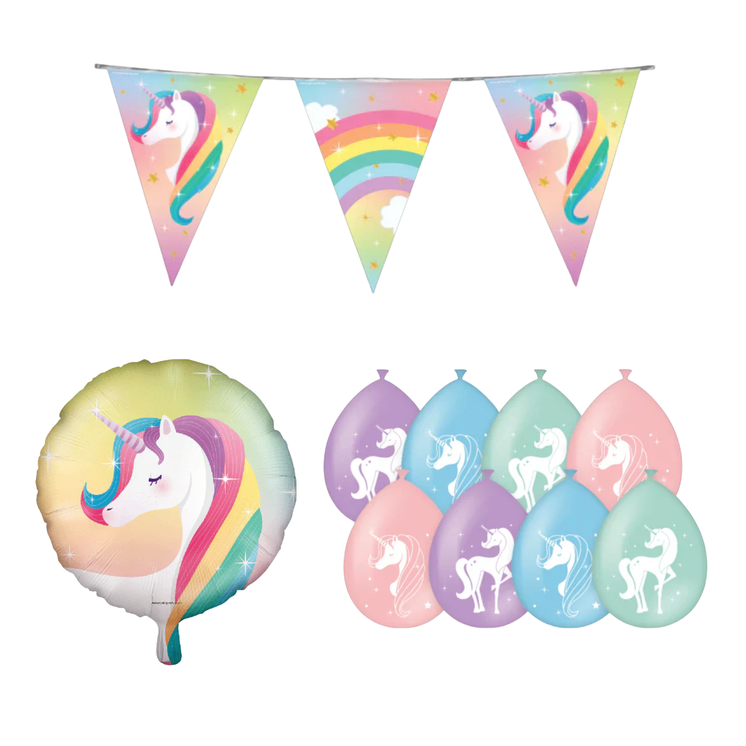 Het pakket bestaat uit een vrolijke vlaggenlijn met eenhoorns en regenbogen die elke kamer of tuin omtovert tot een echte unicorn-feestlocatie. Daarnaast bevat het pakket acht pastelkleurige ballonnen met eenhoornopdruk die zorgen voor extra magie in de ruimte. De grote ronde folieballon met schattige eenhoorn is de blikvanger van het feest en staat prachtig bij de cadeautafel of bij de jarige zelf.