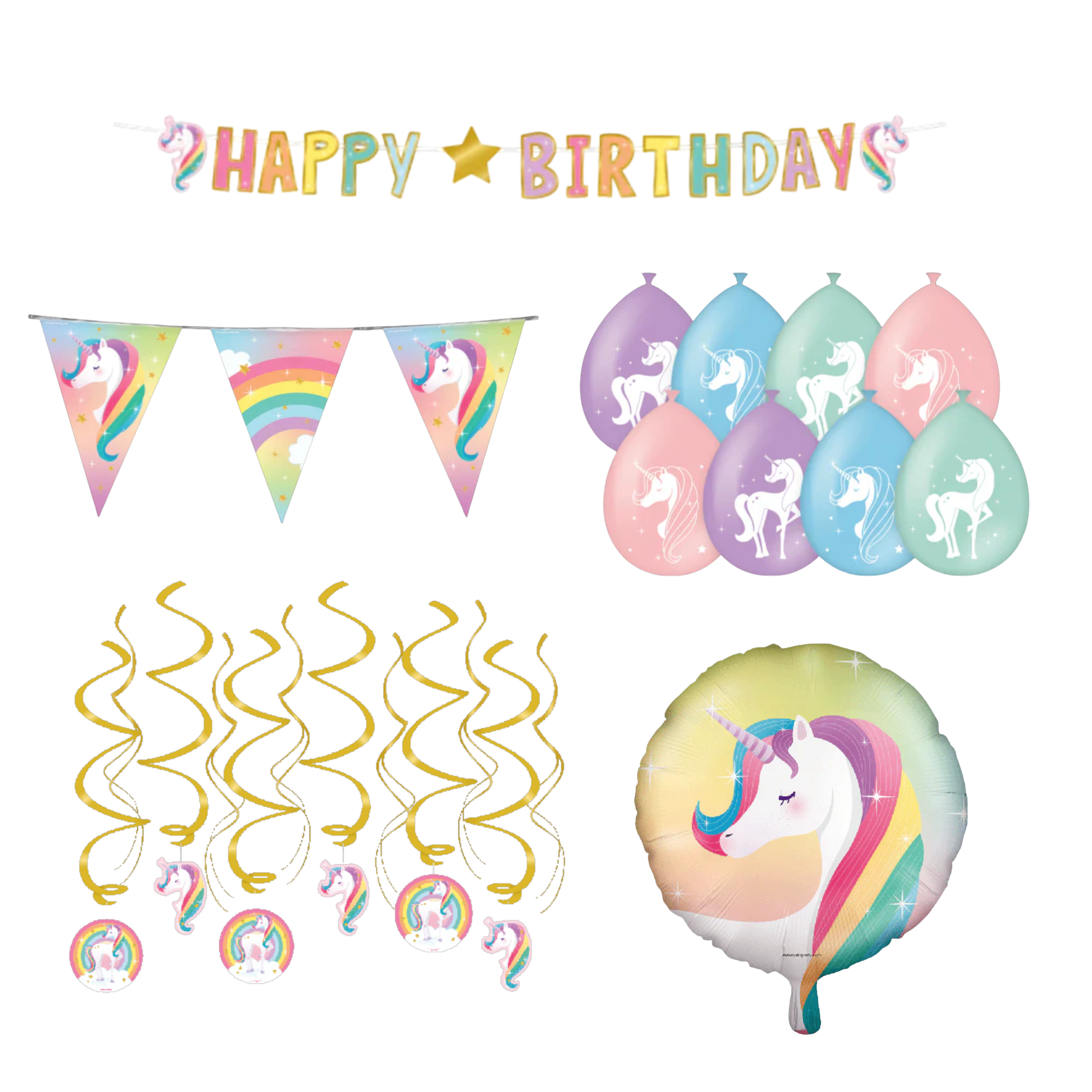 Het pakket bevat een vrolijke “Happy Birthday” letterslinger in pastelkleuren met gouden sterretjes, ideaal om de jarige extra in het zonnetje te zetten. De eenhoorn vlaggenlijn met regenbogen en sterretjes geeft elke ruimte een dromerige uitstraling en is eenvoudig op te hangen. Daarnaast zitten er acht pastelkleurige ballonnen met unicornopdruk in het pakket die voor extra kleur en magie zorgen. De grote ronde folieballon met prachtige eenhoorn is een echte eyecatcher en past perfect bij de cadeautafel of stoel van de jarige.