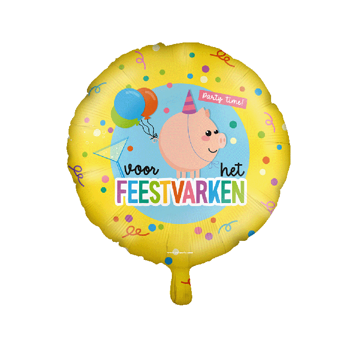 Breng extra vrolijkheid naar een verjaardag met deze ronde folieballon met de tekst Voor het feestvarken. Het speelse ontwerp met een feestvarken, ballonnen en confetti maakt deze ballon perfect voor kinderen en zorgt meteen voor een feestelijke sfeer.