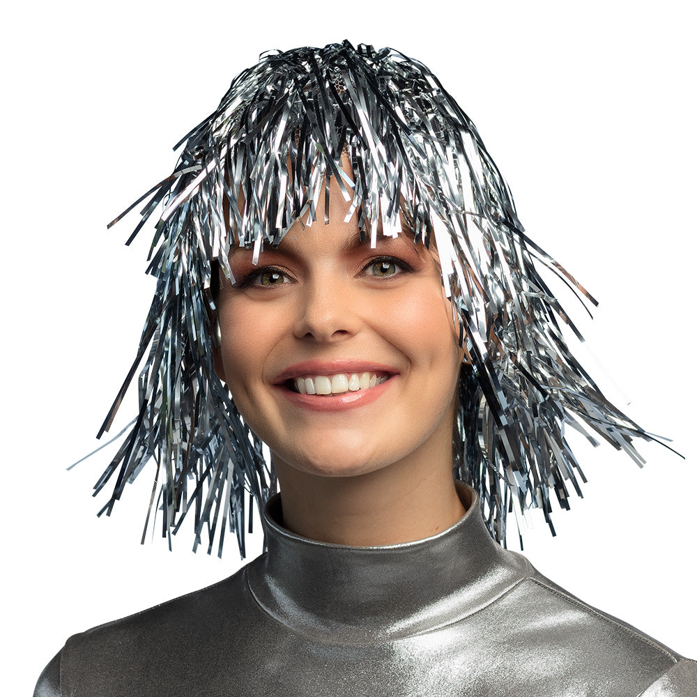 Vrolijke partypruik van folie. De stroken zilverkleurige folie maken van deze damenspruik een vrolijk geheel. Zo ben je een stralend middelpunt van elk feestje.