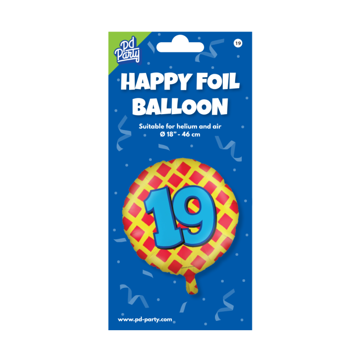 Vier de 19e verjaardag op een kleurrijke manier met deze vrolijke folieballon van 45 cm. De ballon heeft een opvallend gekleurd ruitpatroon met een groot cijfer 19 in het midden, waardoor hij direct de aandacht trekt. Geschikt voor zowel helium als lucht, perfect om op te hangen, neer te zetten of als verrassing bij een feestelijke verrassing. Ideaal voor een verjaardag, feestje of als decoratie bij een 19-jarige mijlpaal.
