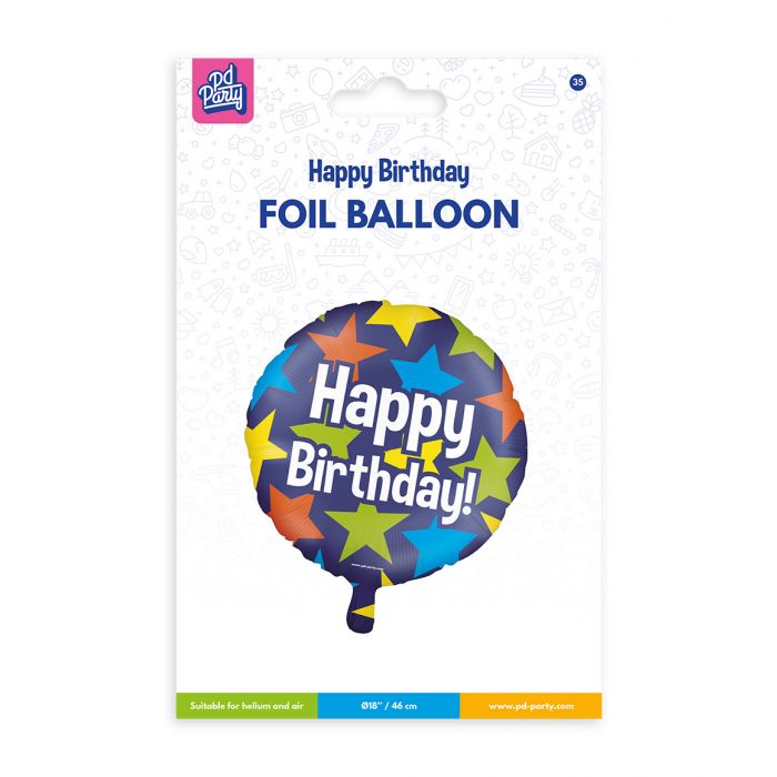 Maak elke verjaardag extra feestelijk met deze kleurrijke folieballon met de tekst “Happy Birthday!”. De ballon is versierd met vrolijke sterren in felle kleuren op een donkerblauwe achtergrond, waardoor hij perfect past bij elke verjaardagsdecoratie. Met een formaat van 45 cm is hij geschikt voor zowel helium als lucht. Deze ballon brengt direct een feestelijke sfeer in huis en is ideaal als eyecatcher bij een verjaardagsfeest of als cadeautje voor de jarige.