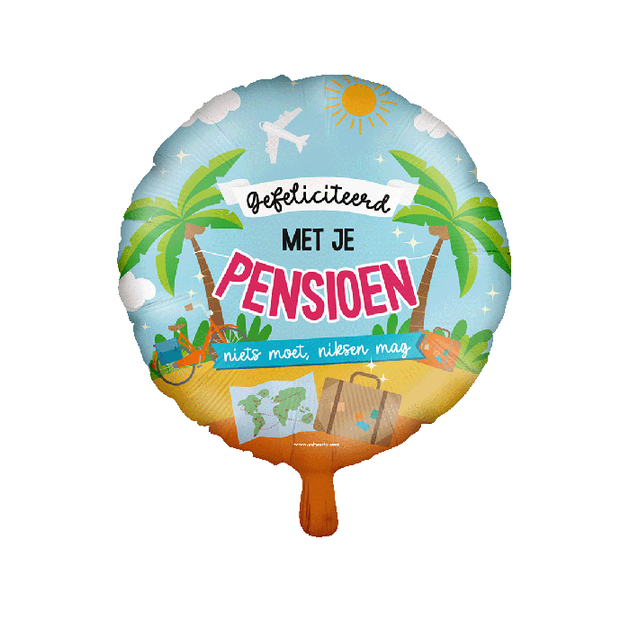 Vier een welverdiend pensioen op een feestelijke manier met deze ronde folieballon met de tekst Gefeliciteerd met je pensioen. Het vrolijke design met palmbomen, zon, koffers en een vliegtuig staat symbool voor ontspanning en vrije tijd: niets moet, niksen mag.