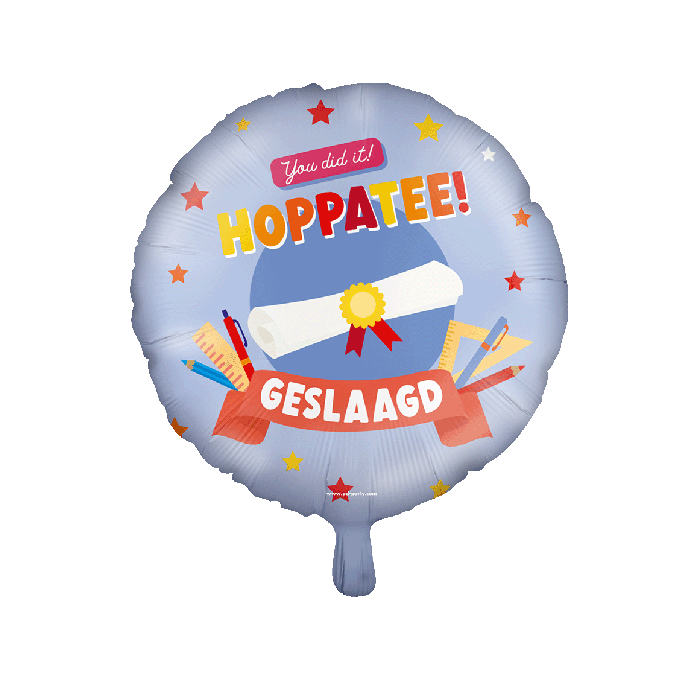 Vier een diploma of schoolresultaat op een feestelijke manier met deze ronde folieballon met de tekst Hoppatee! Geslaagd. Het vrolijke design met sterren, schoolspullen en een diploma maakt deze ballon de perfecte verrassing voor iedereen die net geslaagd is.