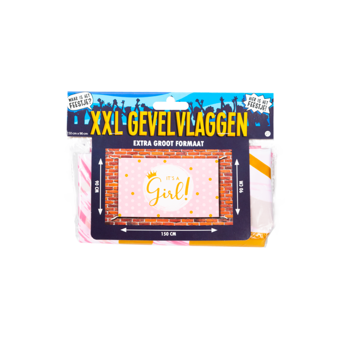 Maak de geboorte van jullie dochter extra feestelijk met deze XL gevelvlag! Met een formaat van 150 x 90 cm is deze vlag een echte blikvanger en perfect om aan de gevel, het raam of in de tuin te hangen. De roze achtergrond met stijlvolle opdruk “It’s a Girl!” straalt vrolijkheid en trots uit. Gemaakt van stevig materiaal en eenvoudig op te hangen, zodat iedereen kan zien dat er een prachtig meisje is geboren.
