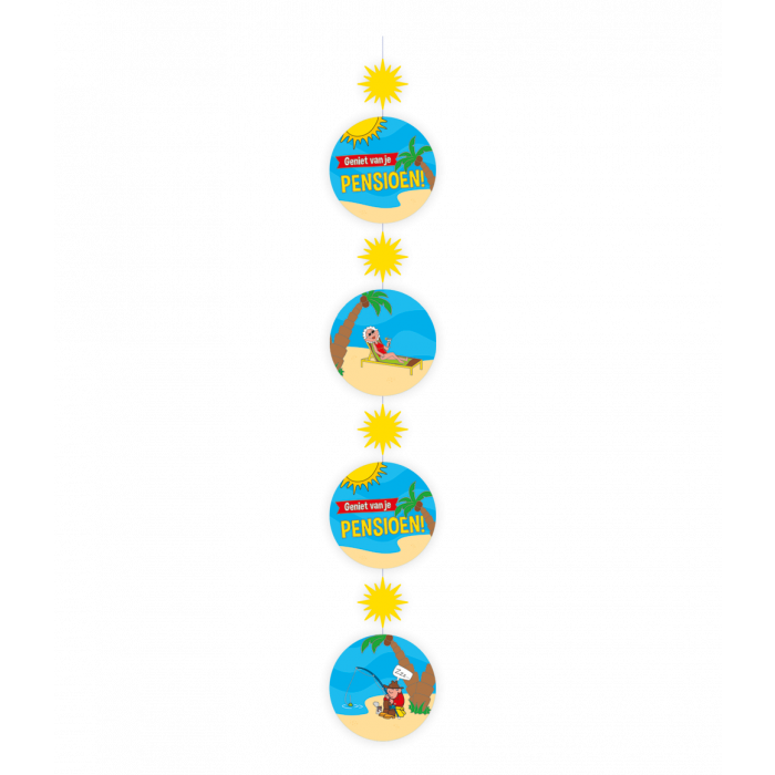 Maak een pensioenfeest extra feestelijk met deze Hangdecoratie Pensioen. De decoratie bestaat uit vrolijke hangers met zomerse illustraties en de tekst Geniet van je pensioen! die meteen voor een gezellige sfeer zorgen.