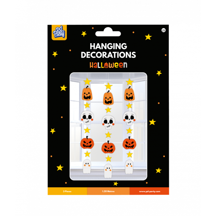 De Hanging Decoration Halloween is de perfecte versiering om je huis of feestlocatie in griezelige sferen te brengen. Deze set bestaat uit 3 hangdecoraties van 1,20 meter lang, met figuren zoals pompoenen, schedels en spoken. Hang ze eenvoudig voor het raam, in een deuropening of aan het plafond en creëer direct een spookachtige uitstraling. Ideaal voor een Halloweenfeest, trick-or-treat avond of om de woonkamer extra spannend te maken.
