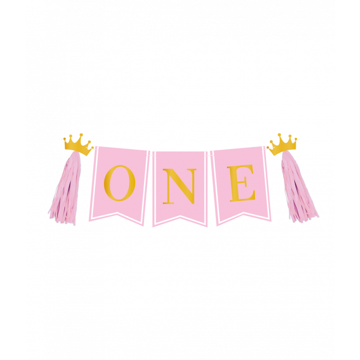 De High Chair Banner First Birthday Girl maakt de eerste verjaardag van je dochter extra feestelijk. De roze vlaggetjes met gouden letters spellen het woord "ONE" en zijn versierd met kroontjes en tassels aan de zijkanten, waardoor de kinderstoel meteen een echte blikvanger wordt. Perfect voor het versieren van de stoel tijdens het taartmoment, de fotoshoot of het verjaardagsfeestje. Deze banner zorgt voor een vrolijke en stijlvolle uitstraling en maakt de eerste verjaardag van je meisje onvergetelijk.