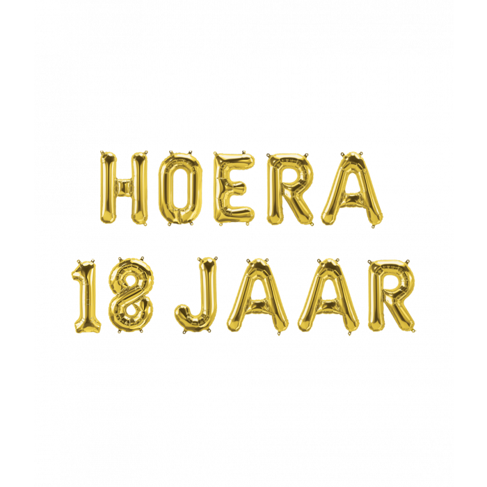 Hoera 18 jaar folieballon set, super leuke folieballonnen voor een gezellig 18 jaar feestje. De ballonnen zijn metallic goud van kleur en zijn 41cm hoog. Je kunt er een slinger van ca. 200cm van maken, met het bijgeleverde draad.