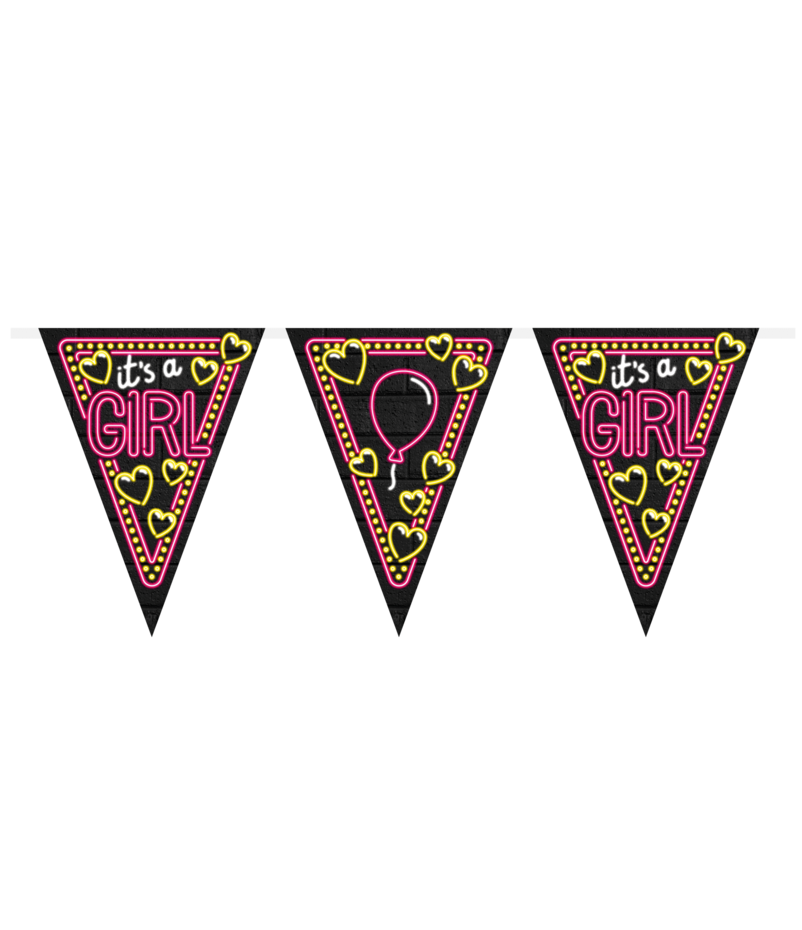 De slinger It's a Girl Neon is gemaakt van plastic en heeft een lengte van ca. 10 meter. De Neon gekleurde slinger met de tekst It's a Girl wordt per stuk geleverd.
