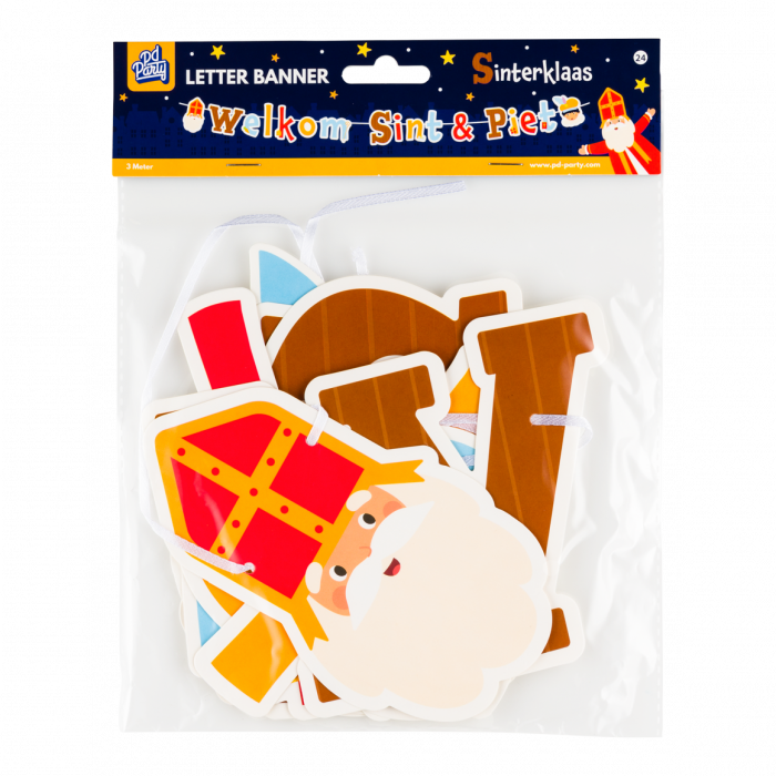 De Letter Slinger Sinterklaas – Welkom Sint & Piet is de ideale versiering voor pakjesavond en het sinterklaasfeest. Met vrolijke kleuren en figuren van Sinterklaas en zijn pieten brengt deze slinger direct de feestelijke sfeer in huis. De slinger is 250 cm lang en eenvoudig op te hangen aan muur, raam of deur. Perfect voor scholen, kinderdagverblijven en thuis bij de viering van dit oer-Hollandse feest.