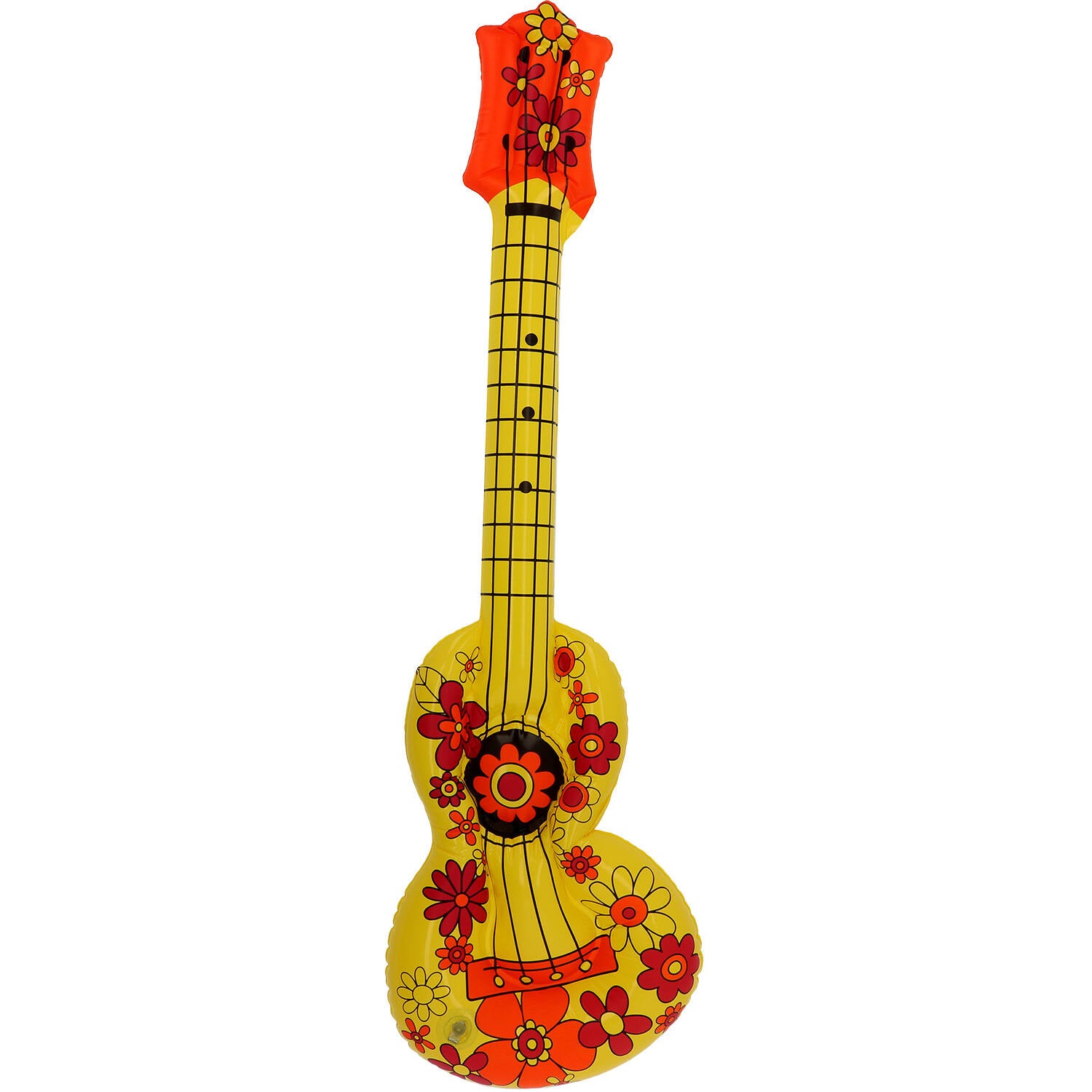 Jij bent de beste speler van het feestje met deze zomerse opblaas gitaar van 80cm. Deze gele akoestische gitaar is versierd met vrolijke bloemen, en is ideaal voor een Hawaii of zomers themafeestje. Deze opblaas gitaar is de ideale accessoire. bij elke Hawaii of Hippie outfit.