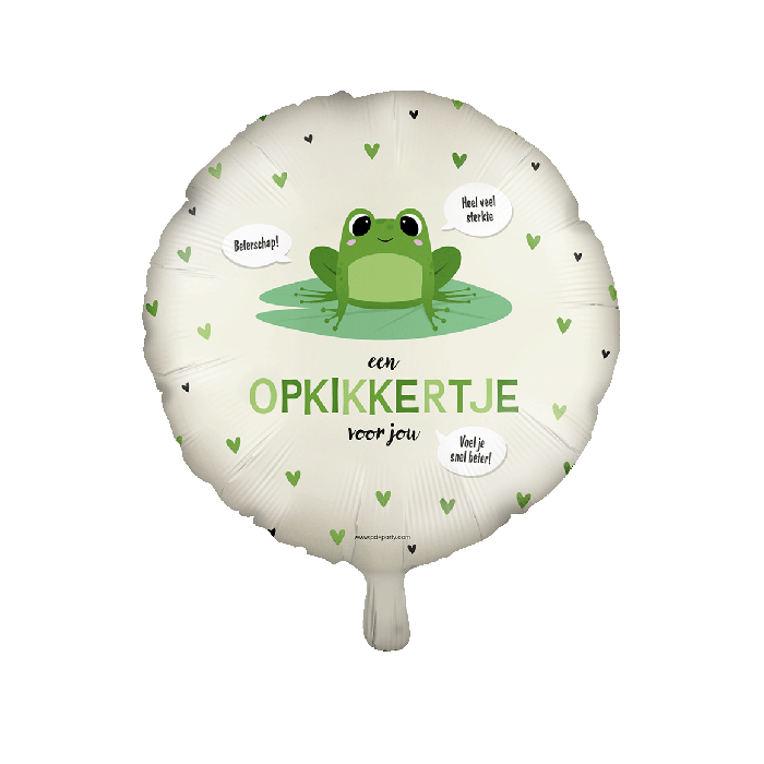 Geef iemand een glimlach en een beetje extra steun met deze ronde folieballon met de tekst Een opkikkertje voor jou. Het lieve ontwerp met een vrolijke kikker en kleine hartjes maakt deze ballon perfect om iemand beterschap, sterkte of een oppepper te wensen.