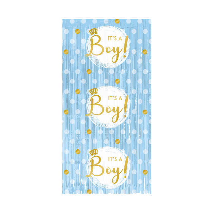 De Party Curtain It’s a Boy is de perfecte decoratie om de geboorte van een jongetje feestelijk aan te kondigen. Dit decoratieve gordijn heeft een formaat van 1 x 2 meter en is bedrukt met de tekst “It’s a Boy!” in gouden letters op een blauwe achtergrond met stippen en accenten. Hang het gordijn eenvoudig op bij een deur, raam of muur en creëer direct een feestelijke sfeer tijdens een kraamfeest of babyshower. Ideaal om familie, vrienden en buren het blijde nieuws in stijl te laten zien.