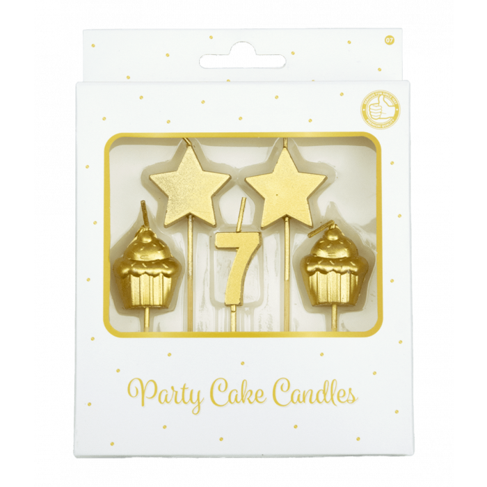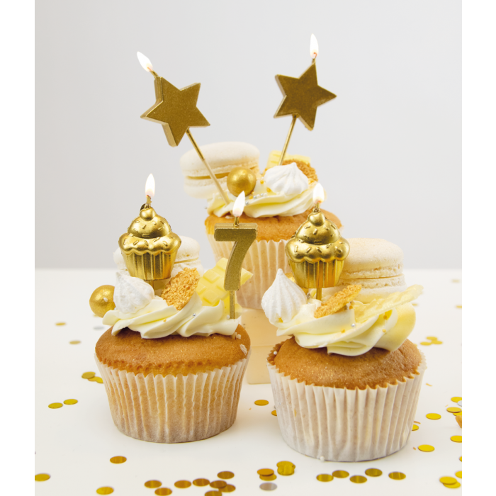 Breng sfeer aan op het 7e verjaardagsfeest met deze stijlvolle gouden kaarsjes. De set bestaat uit vijf kaarsen: het cijfer 7, twee sterren en twee cupcakes met een luxe metallic afwerking. Ze geven de taart een sprankelende look en zijn gemakkelijk te plaatsen. Met een hoogte van 10 cm zijn ze perfect in balans tussen opvallend en elegant. Een schitterende manier om de zevende verjaardag te vieren.