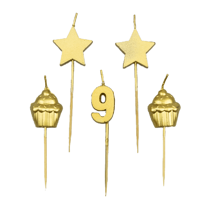 Maak van de 9e verjaardag een echt feest met deze schitterende gouden party kaarsjes. De set bevat vijf kaarsen met het cijfer 9, twee sterren en twee cupcakes die zorgen voor een feestelijke uitstraling. De glanzende gouden kleur geeft elke taart een luxe touch en laat de jarige extra stralen. Dankzij het handige formaat van 10 cm zijn de kaarsjes stevig, goed zichtbaar en makkelijk te plaatsen. Perfect om de verjaardag op een stijlvolle manier te vieren.