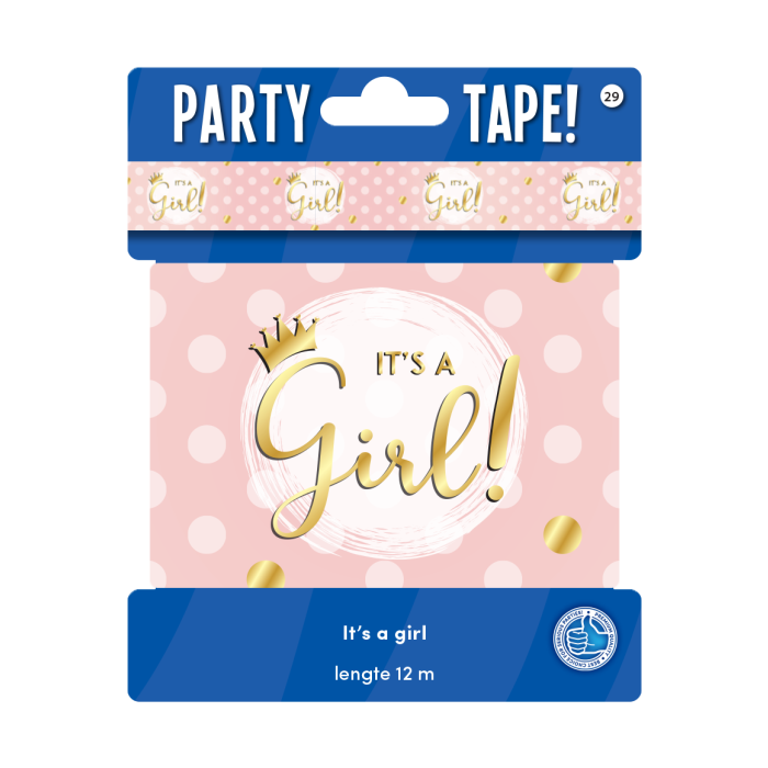 Maak het feest compleet met deze Party Tape It’s a Girl! De roze tape met witte stippen en gouden details is perfect om de geboorte van een meisje te vieren. Versier eenvoudig muren, deuren of meubels en creëer in een handomdraai een vrolijke en feestelijke sfeer.