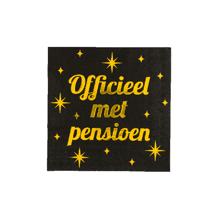 Maak een pensioenfeest extra feestelijk met deze Pensioen Servetten Zwart Goud van 19 cm. De elegante servetten met de tekst Pensioen in zwart-goud design geven direct een luxe uitstraling aan de feesttafel.
