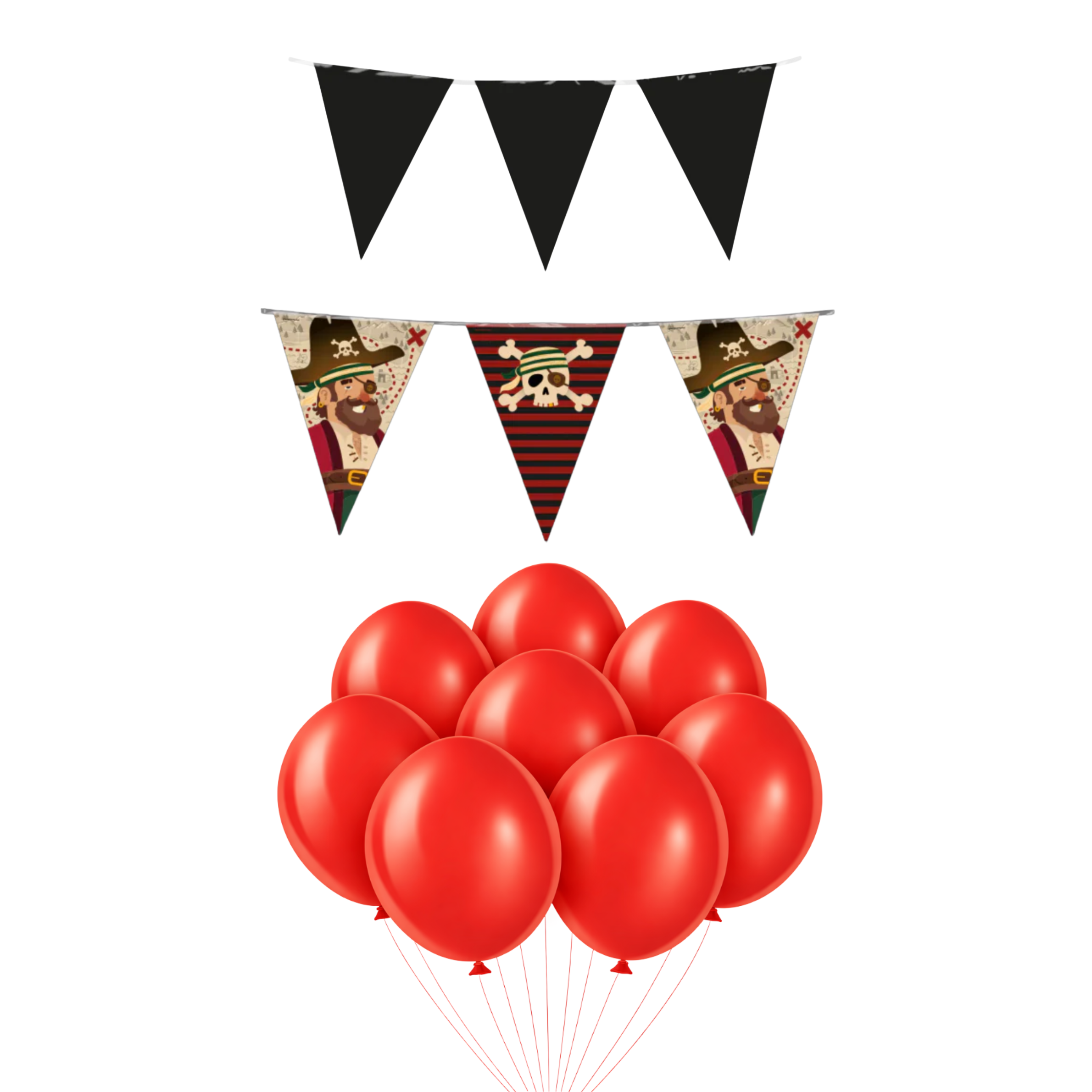 Het pakket bestaat uit twee vlaggenlijnen van elk 10 meter: één met piratenprint en één in stoer effen zwart die perfect bij het thema past. Daarnaast bevat het pakket 10 rode ballonnen (per zak altijd 10 stuks) die zorgen voor een felgekleurde piratenlook en mooi aansluiten bij de vlaggenlijnen.