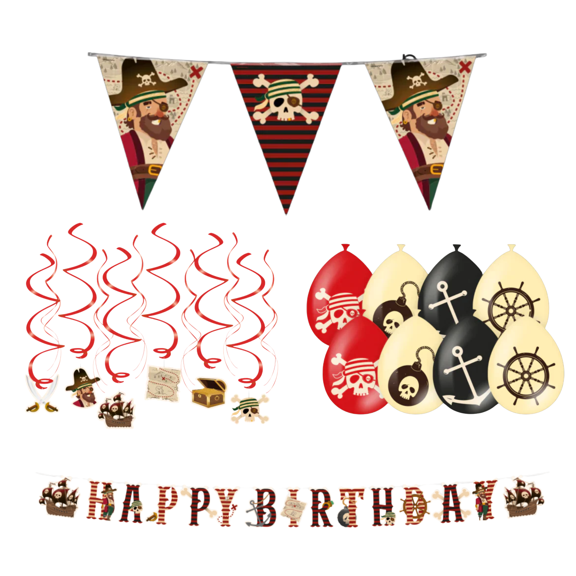 Het pakket bevat een lange piraten vlaggenlijn waarmee je eenvoudig de feestruimte, woonkamer of tuin kunt decoreren. De set is verder uitgebreid met twaalf rode swirls met hangende piratensymbolen zoals een schatkist, piratenhoed, schedel en schatkaart die speels meebewegen in de lucht. Ook inbegrepen is een set stoere ballonnen in rood, zwart en crème met piratenprints zoals ankers, roeren, bommen en schedels, die direct zorgen voor kleur en spanning.
