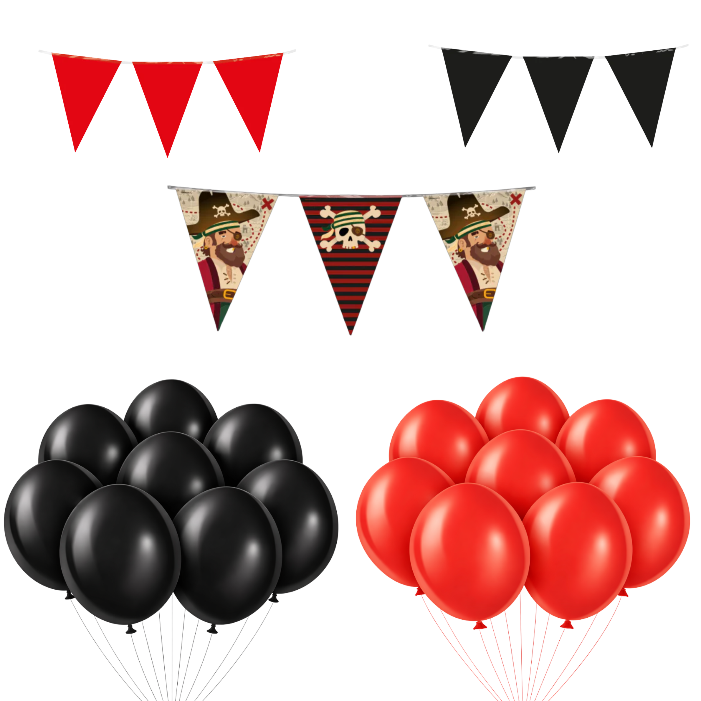Het pakket bestaat uit drie vlaggenlijnen van elk 10 meter: één met piratenprint en twee effen lijnen in rood en zwart die perfect aansluiten bij het thema. Daarnaast bevat het pakket 20 ballonnen, verdeeld over 10 rode en 10 zwarte ballonnen (per zak altijd 10 stuks). Deze kleuren vormen samen een klassiek piratenpalet en vullen de ruimte snel en eenvoudig met feestelijke decoratie.