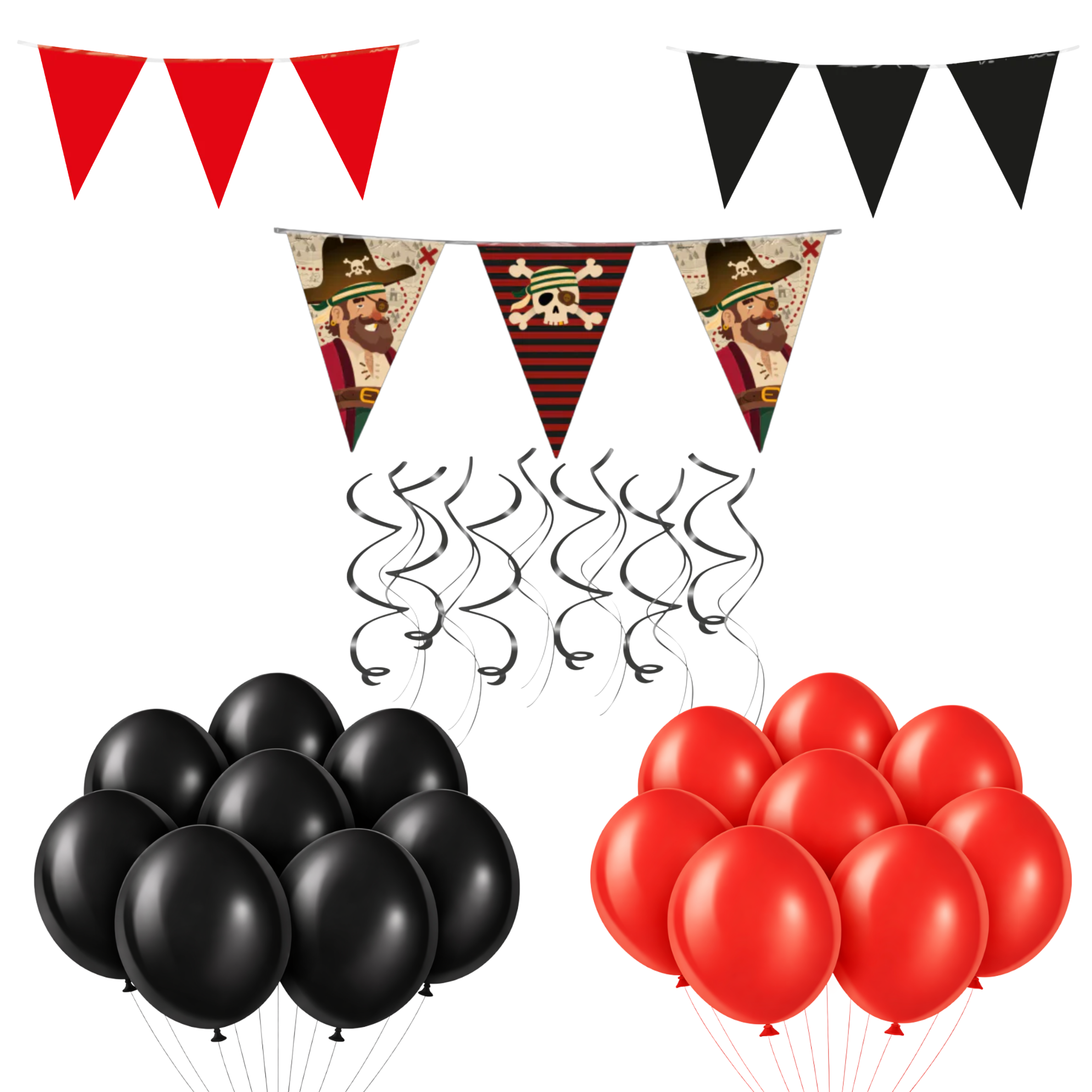 Het pakket bestaat uit drie vlaggenlijnen van elk 10 meter: één met piratenprint en twee effen vlaggenlijnen in rood en zwart die perfect aansluiten bij het thema. Daarnaast bevat het pakket 20 ballonnen, verdeeld over 10 rode en 10 zwarte ballonnen (per zak altijd 10 stuks), waarmee je eenvoudig de hele ruimte kunt vullen. De 12 zwarte swirls maken het geheel af en bewegen vrolijk mee, waardoor de decoratie echt tot leven komt.