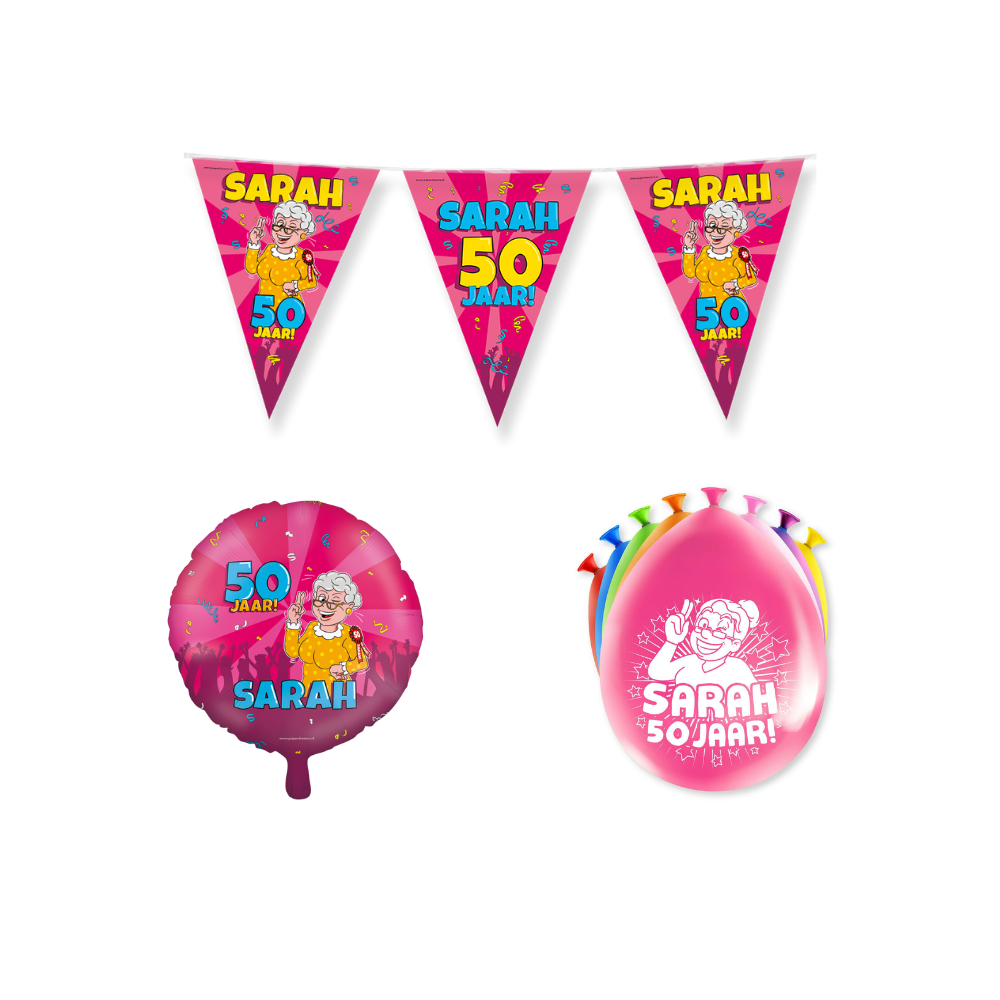 Wordt er binnenkort iemand 50? Dan mag een feestelijke versiering natuurlijk niet ontbreken! Met dit Sarah Versiering Pakket zorg je ervoor dat de jarige stralend in het middelpunt van de aandacht staat. Ideaal voor thuis, in de tuin of op een feestlocatie!
