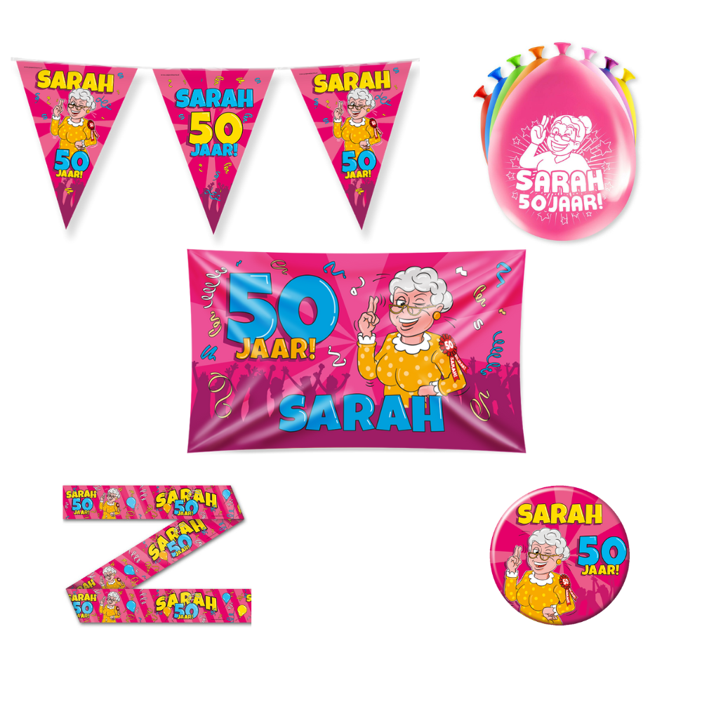 Wordt er binnenkort iemand 50? Dan mag een feestelijke versiering natuurlijk niet ontbreken! Met dit Sarah Versiering Pakket zorg je ervoor dat de jarige stralend in het middelpunt van de aandacht staat. Ideaal voor thuis, in de tuin of op een feestlocatie!