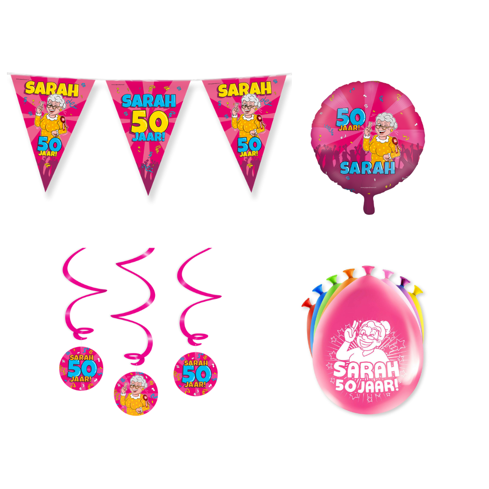 Wordt er binnenkort iemand 50? Dan mag een feestelijke versiering natuurlijk niet ontbreken! Met dit Sarah Versiering Pakket zorg je ervoor dat de jarige stralend in het middelpunt van de aandacht staat. Ideaal voor thuis, in de tuin of op een feestlocatie!