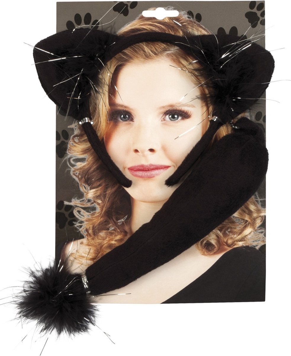 Leuke dierenset zwarte kat bestaande uit kattenoortjes diadeem en kattenstaart.