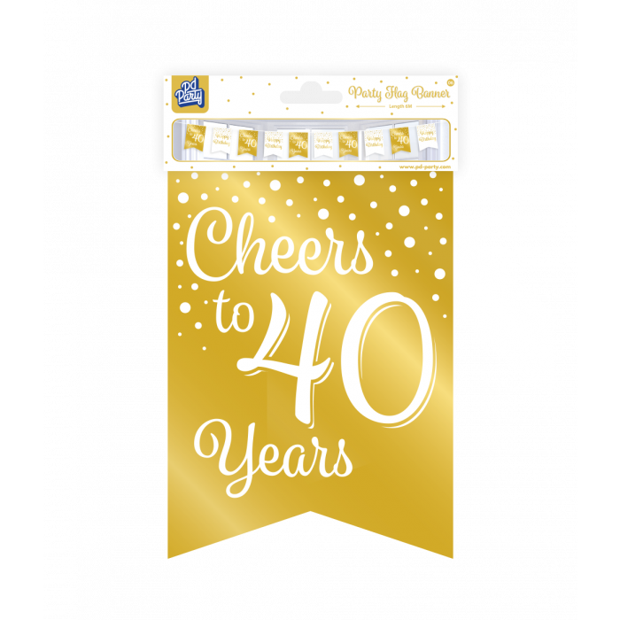 Maak jouw 40e verjaardag extra feestelijk met deze stijlvolle slinger 40 jaar in goud en wit. Met een lengte van 6 meter en een luxe design geeft deze vlaggenlijn direct een chique uitstraling aan jouw feestlocatie. De slinger is bedrukt met het cijfer 40 en is perfect om op te hangen in de woonkamer, tuin of feestzaal. Combineer hem met bijpassende ballonnen of andere 40 jaar versiering in goud en wit voor een onvergetelijk verjaardagsfeest of jubileum.