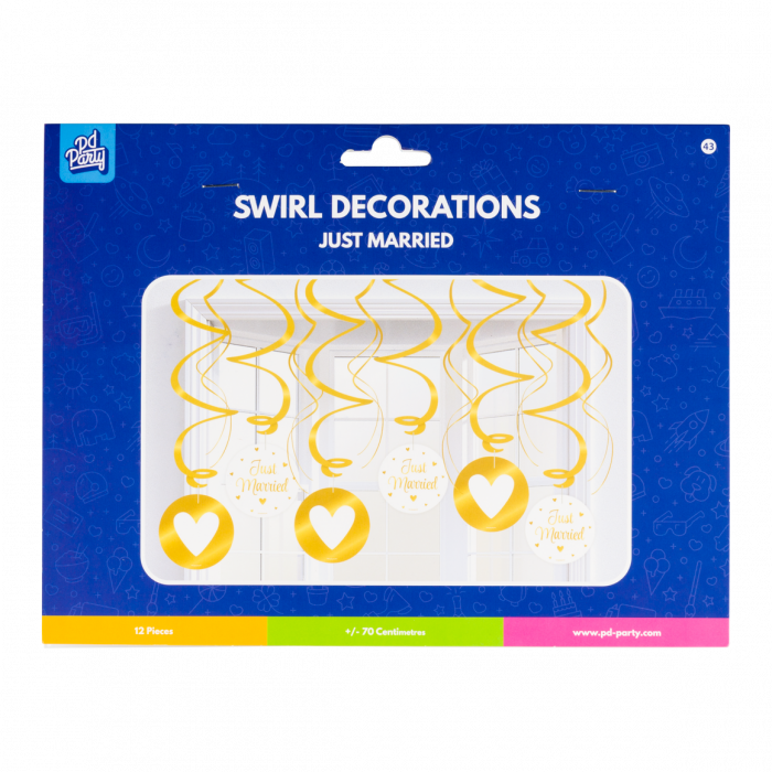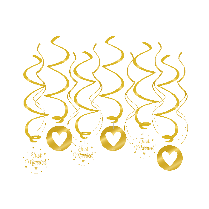 Met de Swirl Decoraties Just Married kleed je jullie trouwdag of huwelijksfeest op een feestelijke en stijlvolle manier aan. Deze set bestaat uit 12 gouden hangdecoraties van circa 70 cm lang, bedrukt met hartjes en de tekst “Just Married”. De swirls zijn eenvoudig aan het plafond of in deuropeningen te hangen en zorgen direct voor een romantische en feestelijke sfeer. Ideaal voor de feestzaal, receptie of zelfs thuis om de liefde te vieren en het bruidspaar extra in het zonnetje te zetten.