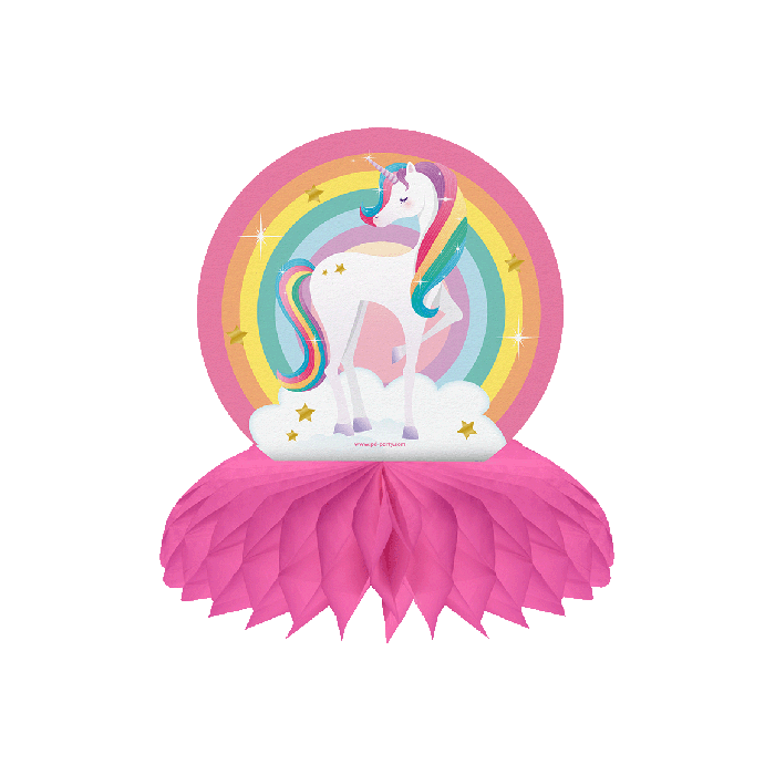Breng wat magie naar de feesttafel met deze schattige eenhoorn tafel decoratie. De kleurrijke eenhoorn staat trots voor een regenboog en wolkjes, perfect voor een vrolijk kinderfeestje of unicorn party. De roze honingraatvoet zorgt voor een speels 3D-effect en maakt de decoratie stabiel op tafel. Met een formaat van ongeveer 17 bij 16,5 centimeter is dit de ideale blikvanger bij het eten, de taart of het cadeautafel. Gemaakt van stevig papier en eenvoudig neer te zetten – een betoverende toevoeging aan elk feestje!